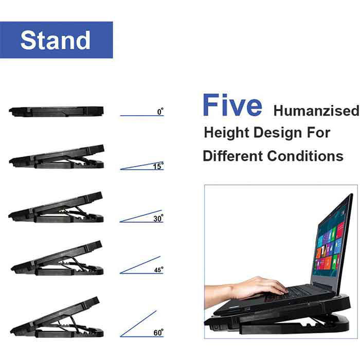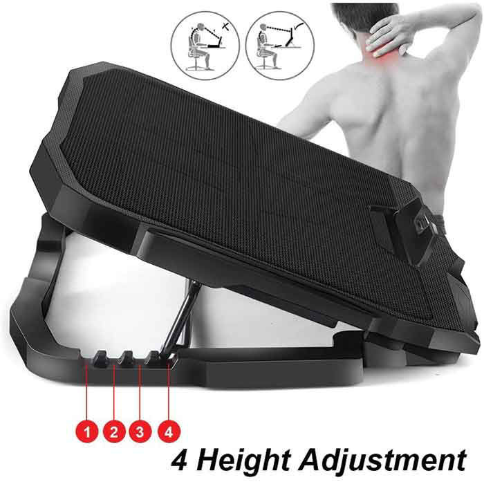 مبرد كمبيوتر محمول بتصميم مريح مع 5 إعدادات ارتفاع قابلة للتعديل والتي تناسب احتياجاتك حقًا، مما يضمن زاوية رؤية أو كتابة أفضل لتخفيف آلام الرقبة والكتف عند لعب الألعاب، أو مشاهدة الأفلام أو القيام بالعمل لمشاهدة طوال اليوم.