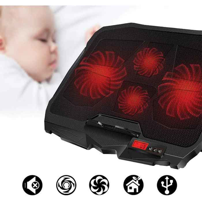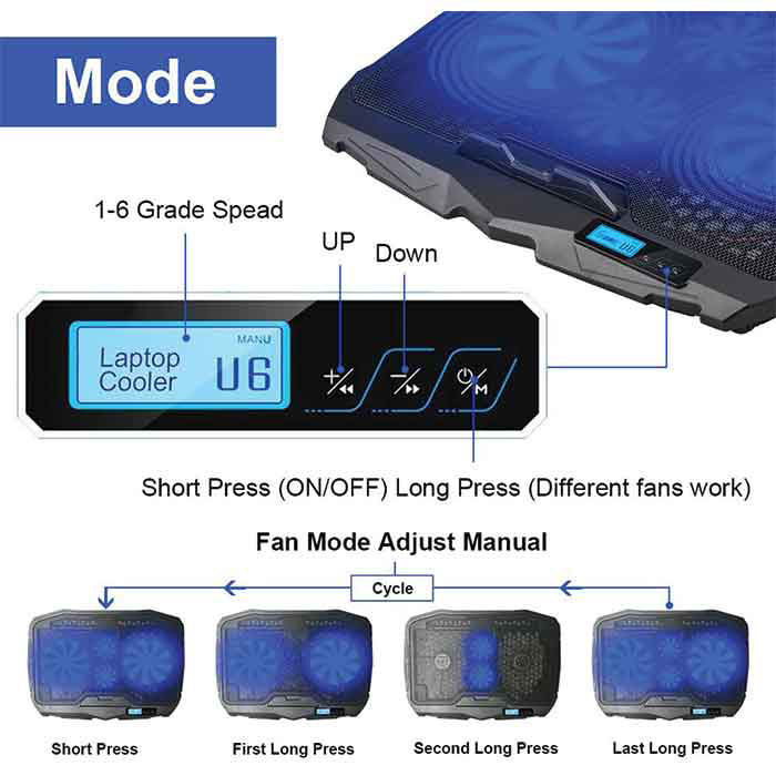 زر عرض الشاشة لتعديل سرعة الرياح لأربع مراوح، مبرد الكمبيوتر المحمول له 6 سرعات و3 أوضاع يمكن تعديله بواسطة زر O/M. إضاءة LED حمراء جذابة لمعرفة أفضل حالة سرعة الرياح للمعجبين.